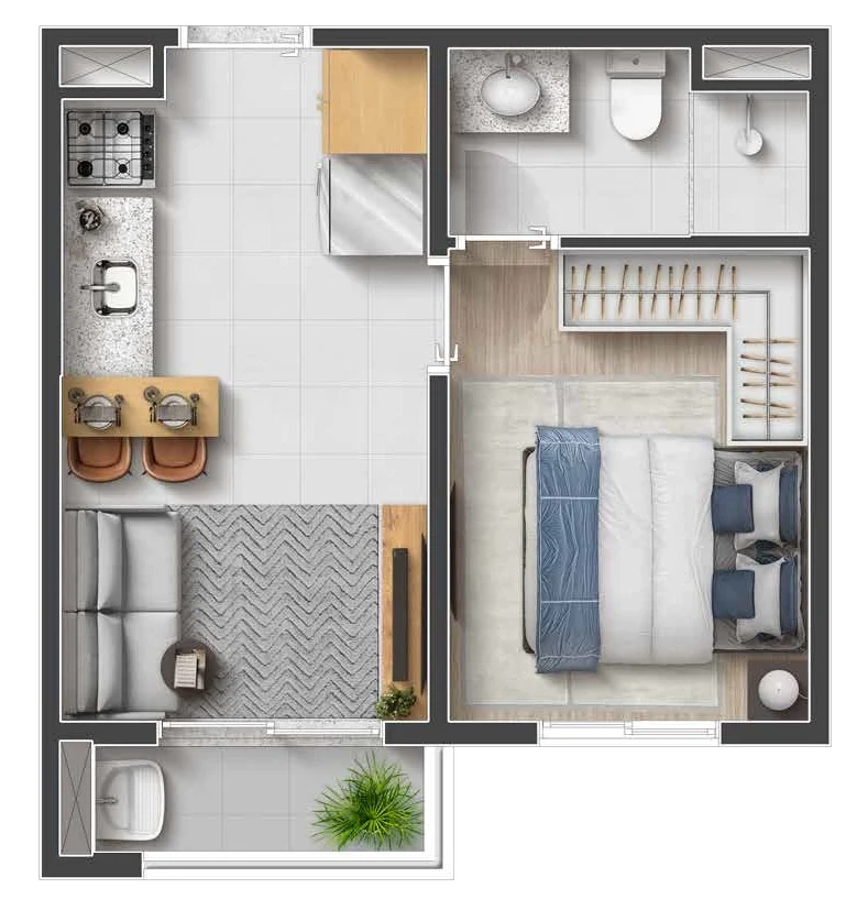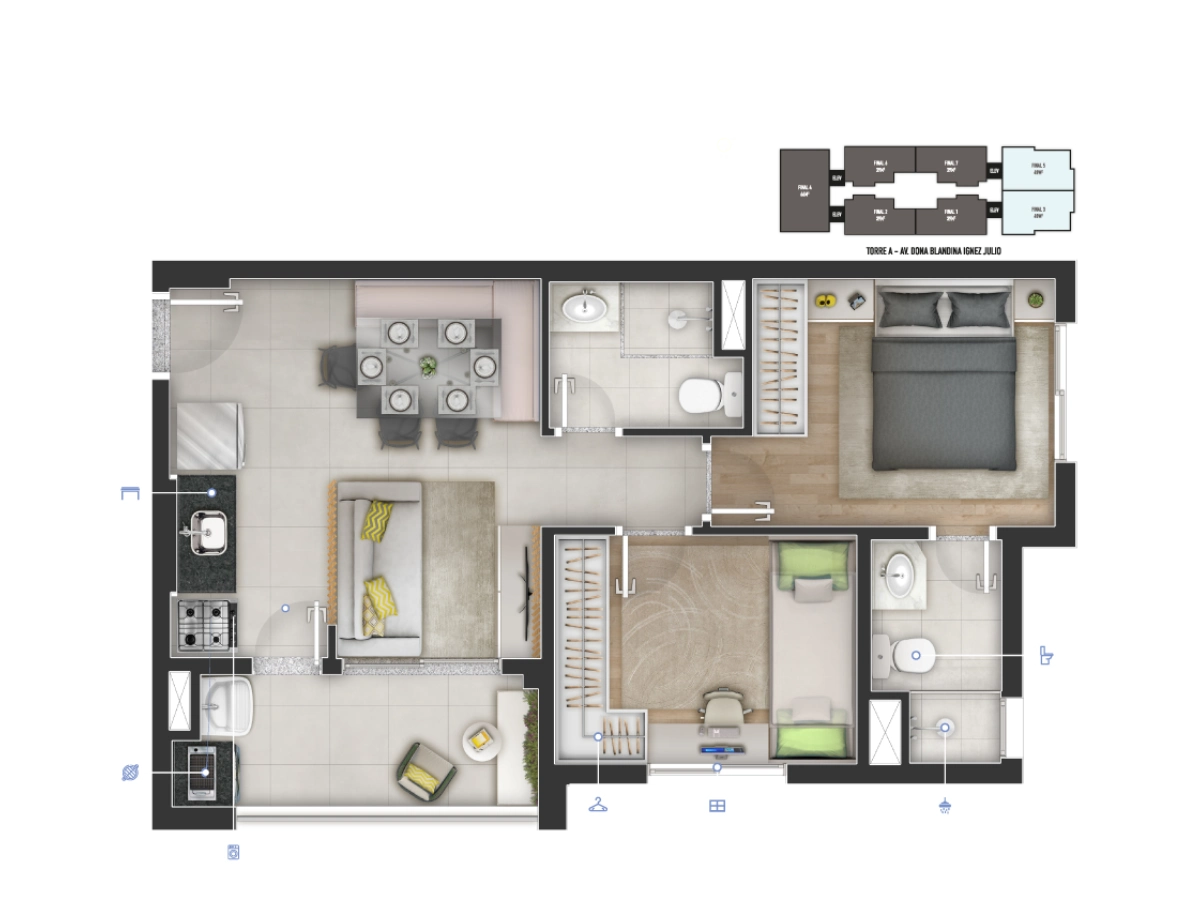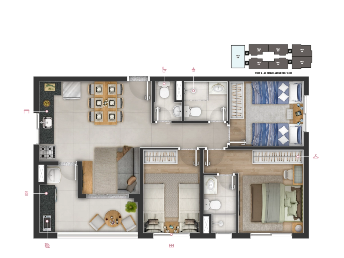 • Dormitórios: 1, 2 e 3